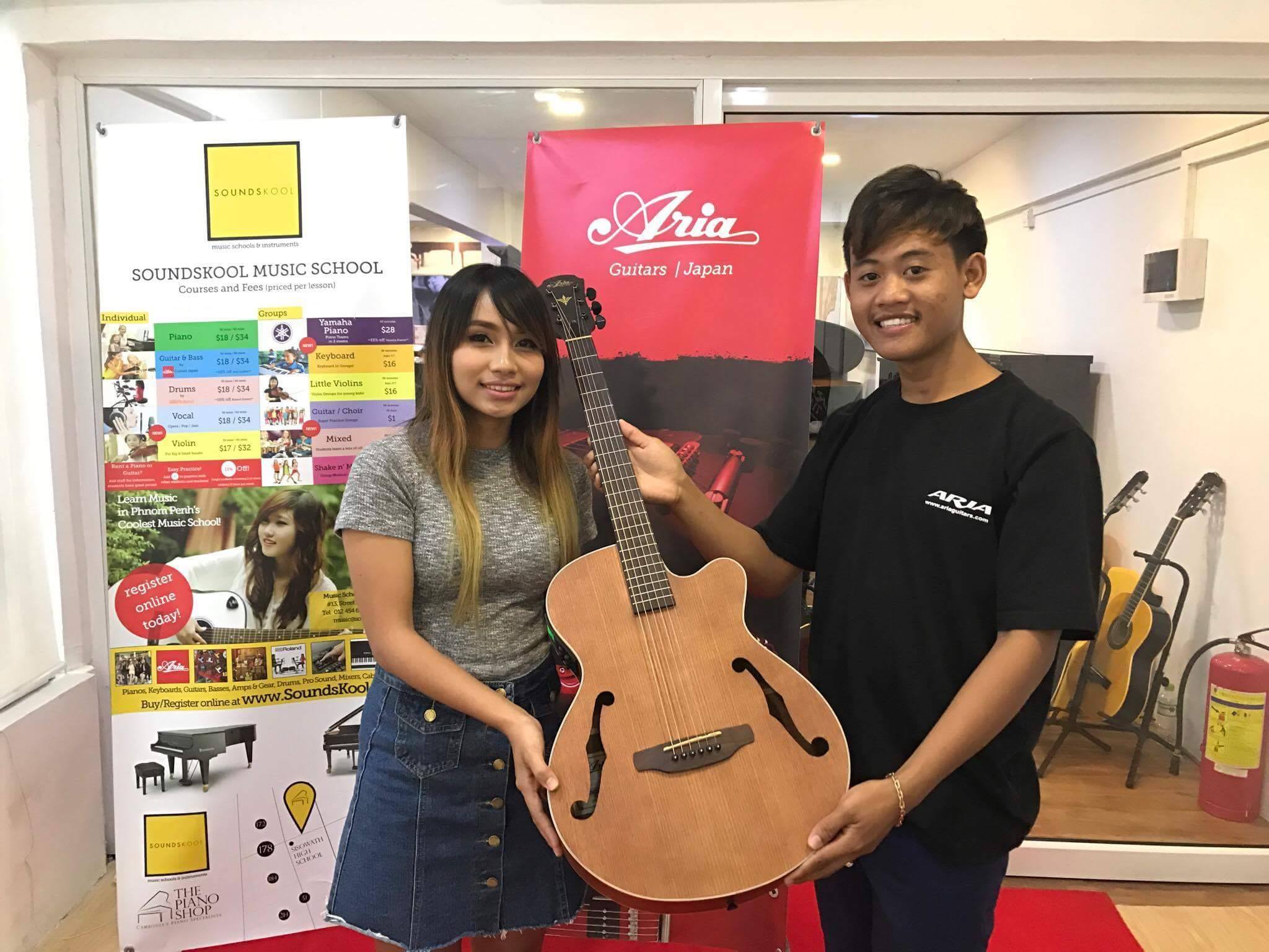 This event was sponsored by Aria Guitars. Mr Han, from Aria Cambodia, was there to present Syra with a beautiful Acoustic Electric guitar, and free gifts to the audience.